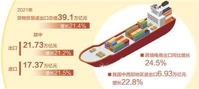 二是全球經濟保持復蘇態勢。2021年,全球經濟整體呈現復蘇態勢,世界銀行、國際貨幣基金組織均預測世界經濟增長5%以上,世界貿易組織預測全球貨物貿易量增長10.8%。2021年,我國對歐盟、非洲出口增速均超過20%,對拉丁美洲出口增速超過40%。從產品看,在上年高增長的基礎上,2021年我國筆記本電腦、平板電腦、家用電器等“宅經濟”相關產品出口合計又增長了13.2%。