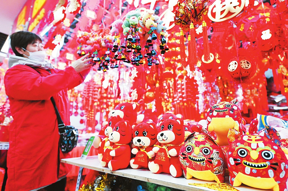 1月14日,太原市某小商品市場內,富有傳統特色的虎枕虎偶等吸引顧客駐足選購。春節臨近,燈籠、春聯、福字等節慶用品中,不少融合了“虎”元素,喜慶紅火中烘托出虎年濃濃的年味。(記者李兆民攝)