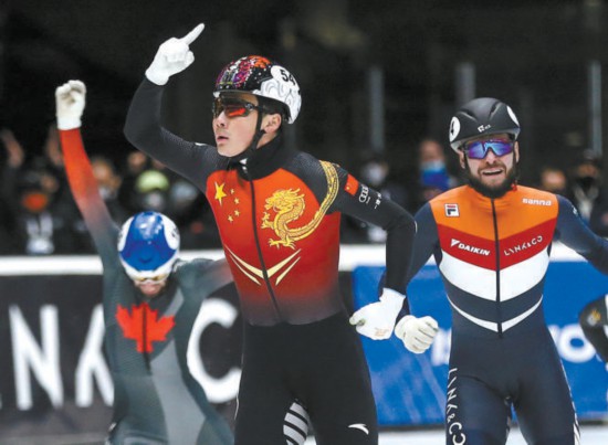 任子威(中)本賽季狀態出色,發揮穩定,這是他在去年11月底進行的短道速滑世界杯多德雷赫特站比賽中奪得男子1500米冠軍后霸氣慶祝。 新華社供圖