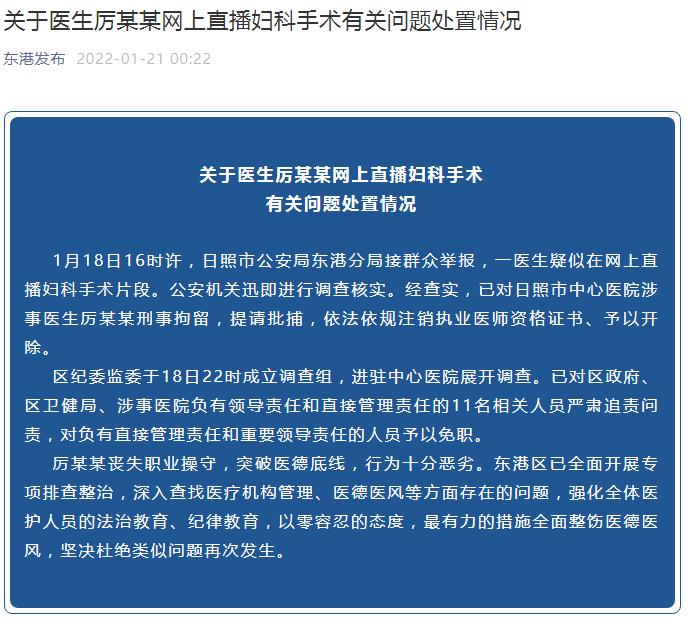 人民網日照1月21日電(聶俊穹)1月21日,山東省日照市東港區委宣傳部發布通報稱:1月18日16時許,日照市公安局東港分局接群眾舉報,一醫生疑似在網上直播婦科手術片段。日照市公安機關迅即進行調查核實。經查實,已對日照市中心醫院涉事醫生厲某某刑事拘留,提請批捕,依法依規注銷執業醫師資格證書、予以開除。