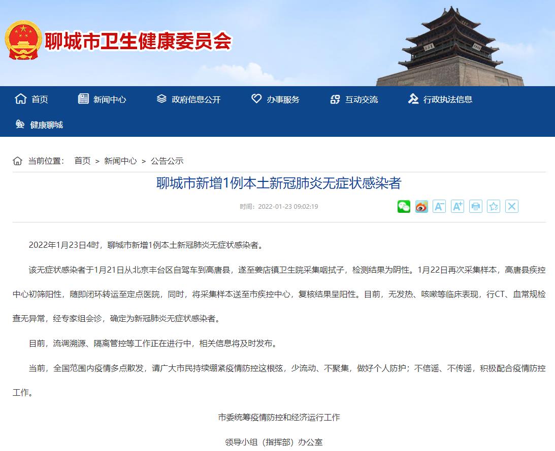 人民網聊城1月23日電 (劉穎婕)據聊城市衛健委通報,2022年1月23日4時,聊城市新增1例本土新冠肺炎無癥狀感染者。