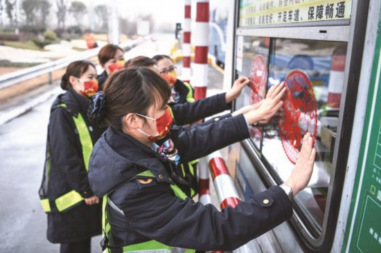 1月24日,在嘉興高速南湖收費站,南湖“紅船”巾幗服務隊的收費員們裝扮著收費站,向排隊等候取卡的駕駛員發放“?!弊帧⒎酪甙蛙囕d垃圾袋,送上一份暖暖的關愛。春節期間,收費員們將堅守崗位,用微笑服務春運,為高速公路暢通保駕護航。(王振宇)