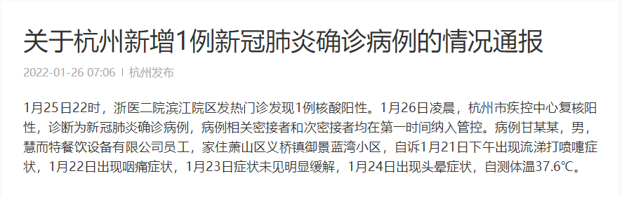1月25日22時(shí),浙醫(yī)二院濱江院區(qū)發(fā)熱門診發(fā)現(xiàn)1例核酸陽(yáng)性。1月26日凌晨,杭州市疾控中心復(fù)核陽(yáng)性,診斷為新冠肺炎確診病例,病例相關(guān)密接者和次密接者均在第一時(shí)間納入管控。病例甘某某,男,慧而特餐飲設(shè)備有限公司員工,家住蕭山區(qū)義橋鎮(zhèn)御景藍(lán)灣小區(qū),自訴1月21日下午出現(xiàn)流涕打噴嚏癥狀,1月22日出現(xiàn)咽痛癥狀,1月23日癥狀未見(jiàn)明顯緩解,1月24日出現(xiàn)頭暈癥狀,自測(cè)體溫37.6℃。
