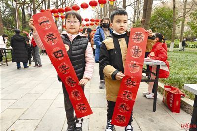“一帆風順年年好,萬事如意步步高”“牛辭勝歲,虎躍新程”……接過滿紙墨香的春聯,游客們個個喜笑顏開。“小書法家”們揮毫潑墨,寫下一幅幅寓意吉祥、承載美好祝福的春聯,楷書、隸書、篆書、行書等字體多種多樣,引得大家連連稱贊。據悉,一個下午的時間里,“小書法家”們共為游客贈送了春聯和福字近600幅。