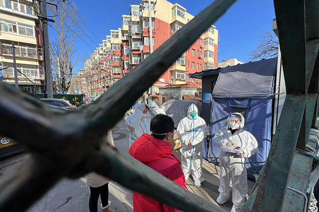 1月25日早8點,室外氣溫低于零度,而今日的大風天氣更降低了體感溫度。在小區門口,街道和社區的“大白”們早已就位,在管控區外值守并隨時準備為身體不便的居民進行入戶核酸檢測工作。