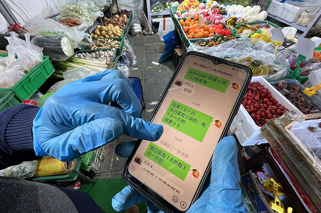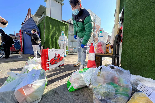 為保障居民買菜用餐等正常生活,院內居民可以通過外賣快遞采購物資,也可以通過社區代為采購。封控區居民通過快遞外賣的購買物品,會在消殺后,由工作人員送至門口。對不會使用網絡購物的居民,社區提供了配餐和送貨上門服務。