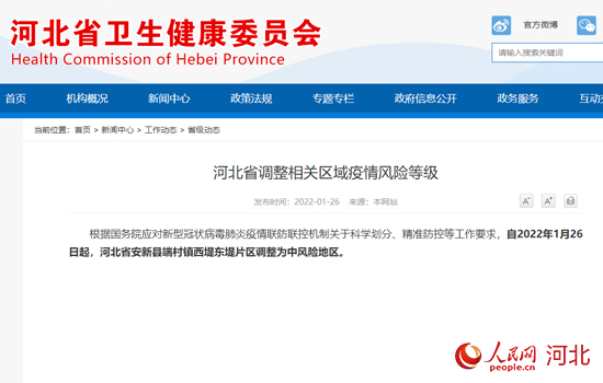 人民網石家莊1月26日電 據河北省衛健委官方網站消息,根據國務院應對新型冠狀病毒肺炎疫情聯防聯控機制關于科學劃分、精準防控等工作要求,自2022年1月26日起,河北省安新縣端村鎮西堤東堤片區調整為中風險地區。