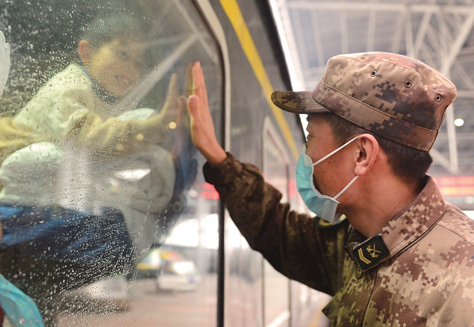 26日,隨著虎年春節臨近,南京火車站迎來春運客流高峰。返鄉旅客懷著對“家”滿滿的愛踏上旅程。圖為一位解放軍戰士與返鄉的兒子隔著車窗玻璃把手掌疊在一起。本報記者 郎從柳 攝
