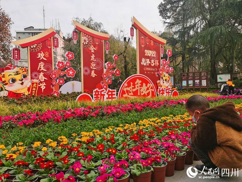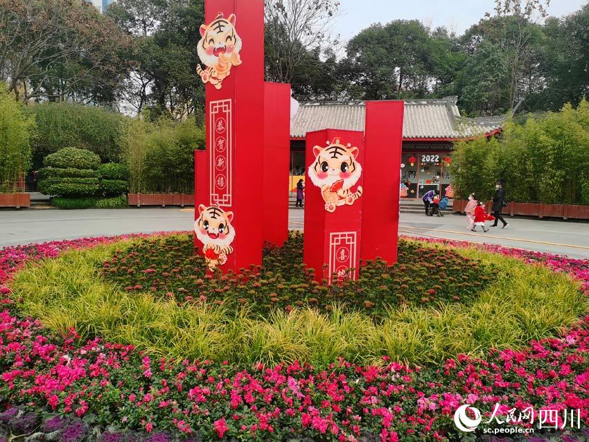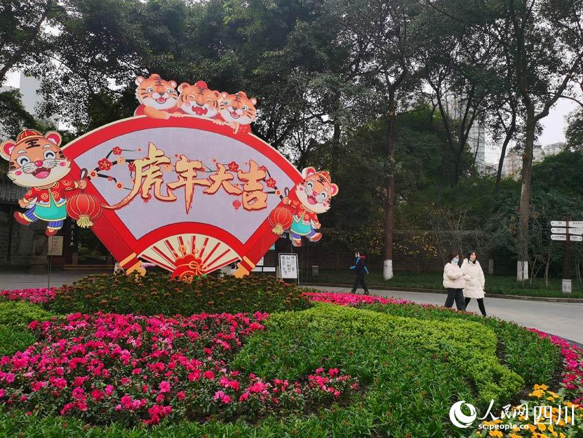 園內的幾處空地上,布置了幾個花壇。上邊除了吉祥的紅黃色彩,還有可愛的動漫形象老虎圖案。“虎年吉祥”“金虎迎春”“新年快樂過年好”……各種好彩頭的詞語,標示出歡度春節的主題,看了讓人精神為之一振。