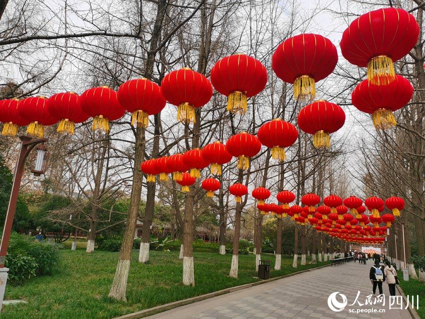公園的大門布置成了喜慶的大紅色,門上門旁掛滿了紅燈籠。一串四個紅燈,既可以理解為“四季平安”,也可以理解為“四季發財”,還可以理解成“四平八穩”……中國文化的詩意內涵,可以激發出人們更多的想象力。