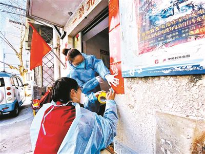 看丹街道工作人員為封控、管控區的小區居民貼春聯 供圖/豐臺區政府