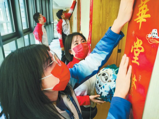 昨天上午,菲律賓、東帝汶、摩納哥、智利、馬達加斯加、法國共6個代表團14人入境后進村入住。下午,拉脫維亞、希臘、斯洛文尼亞、意大利、中國臺北等14個代表團92人進村。目前,村內(nèi)居民達到近800人。抵達當(dāng)天恰逢中國除夕,運動員一進村就感受到一個別樣的運動員之家。各個居住組團高高掛起中式六角造型宮燈,每間運動員公寓也都貼上了對聯(lián),年味撲面而來。