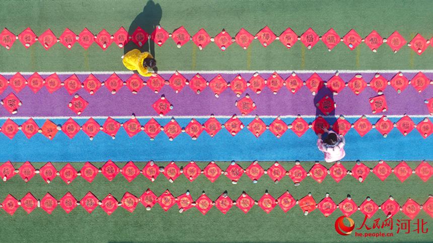 1月17日,河北省唐山市豐潤區(qū)泉河頭鎮(zhèn)羅文口小學(xué)學(xué)生在晾曬為村民書寫的“福”字。 朱大勇攝