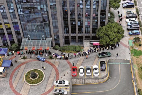 2月17日,在嘉興秀洲區新城街道中禾廣場,居民們排隊有序進行核酸檢測。