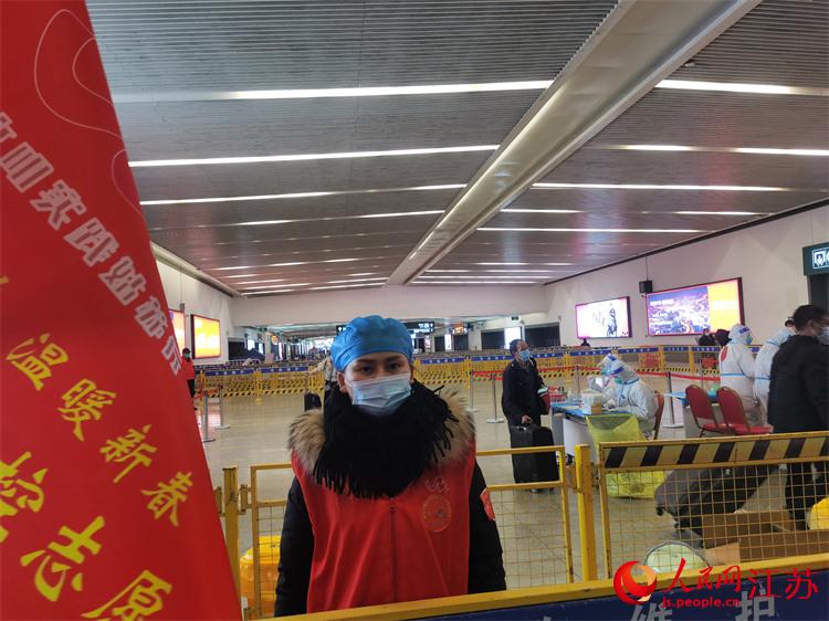 在蘇州火車站參與志愿服務的熱心市民何群飛。人民網記者 王繼亮攝