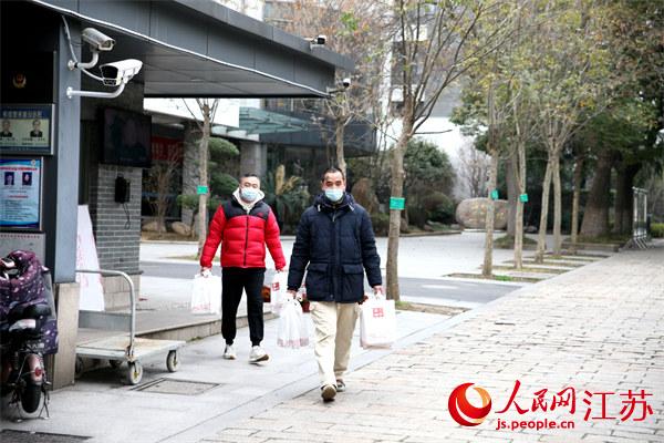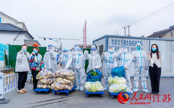 蘇州吳中區木瀆鎮愛心人士嚴麗萍(右一)等為管控區送上愛心蔬菜。木瀆鎮供圖