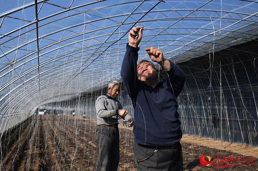 永清縣相輝果蔬農民專業合作社,員工為西瓜種植綁吊秧繩。劉欣羽攝
