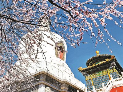春暖大地,北海公園白塔旁的山桃花盛開,吸引不少游客前來欣賞。圖為昨日拍攝的盛開的山桃花掩映著的北海公園白塔。