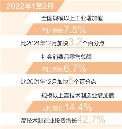 固定資產投資實現良好開局。1至2月,固定資產投資同比增長12.2%,比2021年全年加快7.3個百分點。制造業投資同比增長20.9%,比2021年全年加快7.4個百分點。
