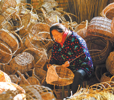 2021年12月28日,安徽省阜陽市阜南縣郜臺鄉劉店村農戶在“柳編巷”內加工編織工藝品。