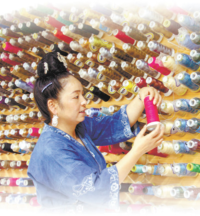 2021年9月16日,在貴州省黔東南苗族侗族自治州施秉縣舞水云臺旅游商品開發有限公司扶貧車間里,繡娘在趕制苗繡產品訂單。