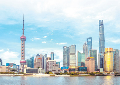 2021年4月25日,從上海外灘眺望陸家嘴,東方明珠塔、上海中心大廈等地標建筑在藍天白云映襯下,組成優美的城市風景。