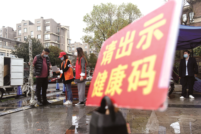 3月17日,在嘉興秀洲區一家小區門口,工作人員身著紅馬甲和同伴冒雨堅守在小區門口,開展替崗輪值,協助社區干部對進入小區的人員逐一驗碼測溫,筑牢疫情防控安全線。(馮玉坤)