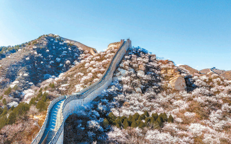 昨天天朗氣清,爛漫的山花將蜿蜒的水關長城裝點得分外妖嬈。本報記者 潘之望攝