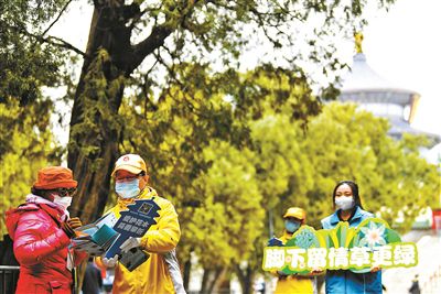 據天壇公園相關負責人介紹,為了強化文明游園理念,盡可能地減少園內不文明游園行為,天壇公園全面啟動春季文明游園宣傳行動。天壇公園由75名職工組成巡視固定崗,每日全天候在園內重點位置巡視不少于96次,同時出動6輛電動巡邏車、3輛電動巡邏自行車對全園及重點區域加強巡視值守;在周末及節假日由首都公共文明引導員、社會志愿者組成流動哨,重點開展不文明游園行為勸導引導工作。