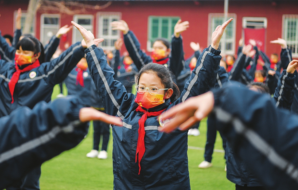 3月24日,臨汾市興國實驗小學,師生們在課間跳律動減壓操。連日來,該校結合閉環管理,為全校師生量身編排了律動減壓操和手舞操,使學生快樂學習、健康生活。(閆銳鵬攝)