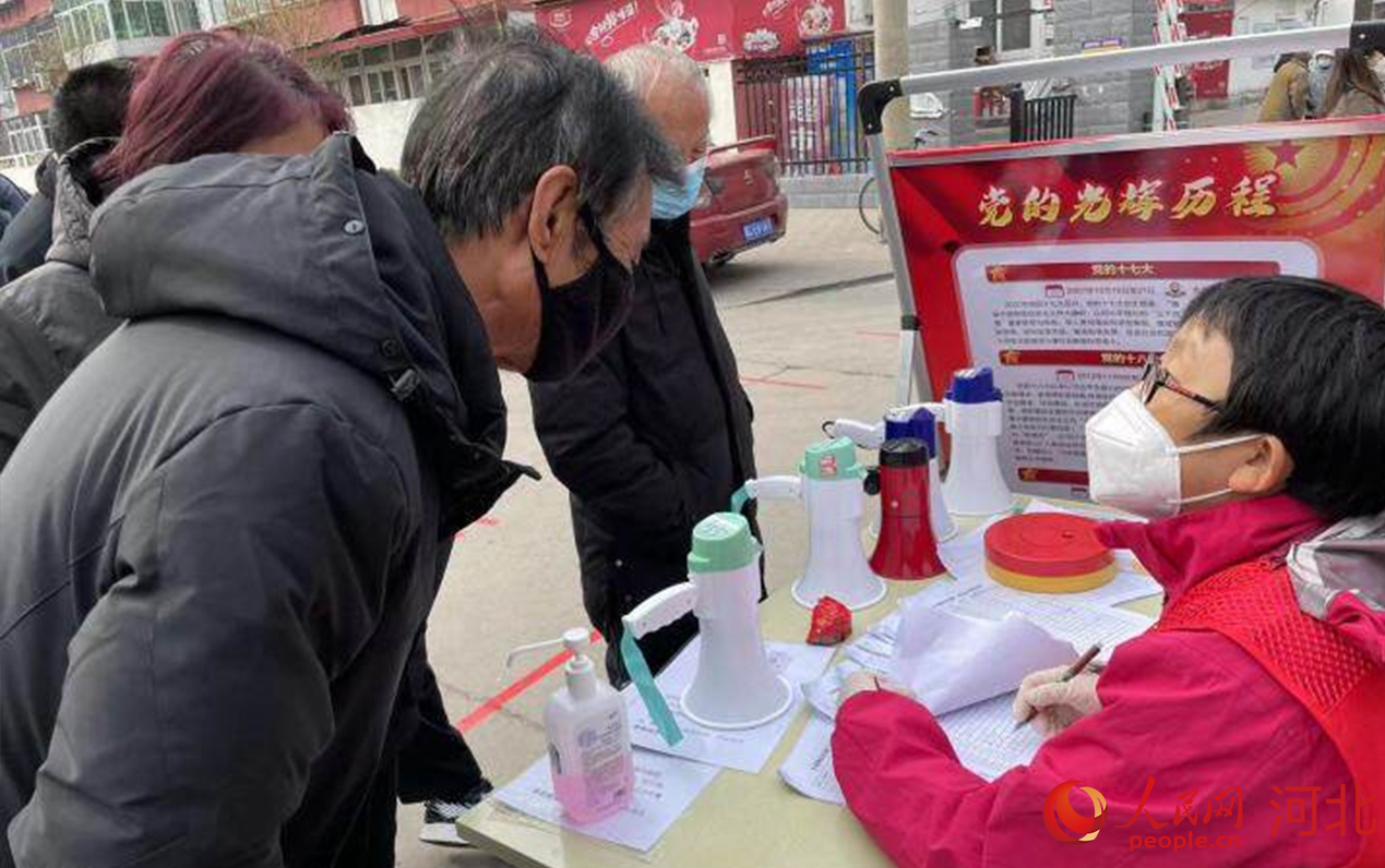 在河北省秦皇島市海港區白塔嶺街道森林逸城社區內,黨員志愿者正在維持現場秩序。 曹建雄攝