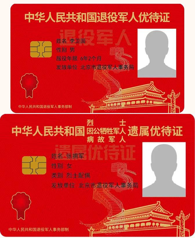 據(jù)介紹,優(yōu)待證以紅色為基調(diào),正面印有優(yōu)待證種類名稱,持證人基本信息、相片等。背面印有制證銀行名稱、銀行卡號等信息。優(yōu)待證分為“中華人民共和國退役軍人優(yōu)待證”“中華人民共和國烈士、因公犧牲軍人、病故軍人遺屬優(yōu)待證”兩種,分別面向符合條件的退役軍人和烈士遺屬、因公犧牲軍人遺屬、病故軍人遺屬等其他優(yōu)撫對象免費(fèi)發(fā)放,是持證人彰顯榮譽(yù)的載體、享受優(yōu)待的憑證。
