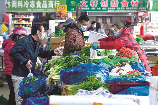 3月30日,在嘉興南湖區荷花堤臨時菜場,疫情防控人員嚴格落實防疫措施,凡是進入菜場必須規范戴好口罩,掃行程碼,出示行程卡,測量體溫。菜場內各類攤位貨物充盈,價格平穩,讓老百姓的“菜籃子”又穩又安全。(張啟帆)