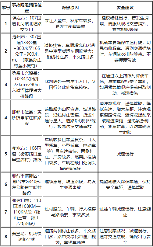有可能出現大流量的站口:石家莊四個端口站、青銀趙縣口、京港澳七一口、大廣衡水北、首都環線(張涿段)野三坡、百草畔、百里峽。有可能出現擁堵的互通立交:京臺與京滬互通、新元與京港澳互通(南)。