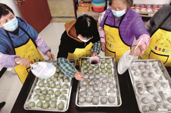 4月1日,嘉興市秀洲區新塍鎮虹橋社區請來轄區的幾位巧手奶奶一起做青團,送到志愿者手中,讓他們在“抗疫”一線也能吃上熱乎乎的時令美食。(馮玉坤)
