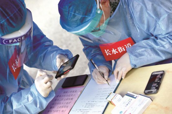 3月31日,嘉興經開區城南街道良秀社區元一柏莊內的兩個點位上,工作人員通知居民排隊有序登記需求藥品并盡可能幫忙購買,滿足管控區居民日常需求。(王蓉)