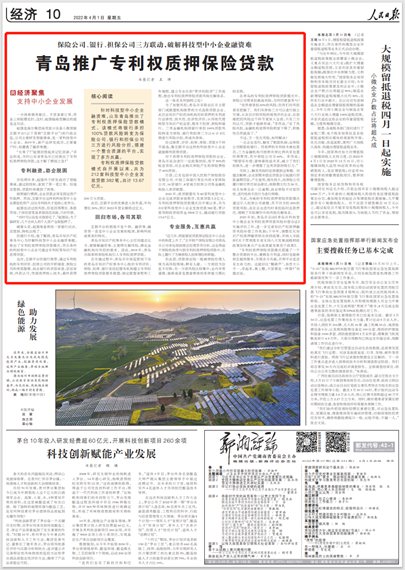 人民日報點贊青島:推廣專利權質押保險貸款 破解科技型中小企業融資難