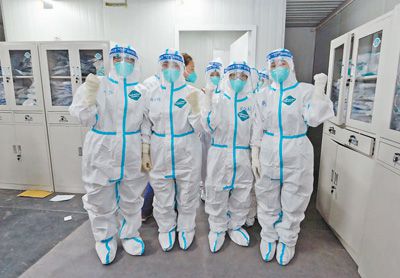 4月8日晚,隨著海南省援滬醫療隊近百名醫護人員的進駐,上海嘉定南翔方艙醫院正式投入運行。圖為醫護人員在入艙前加油鼓勁。新華社記者 李 賀攝