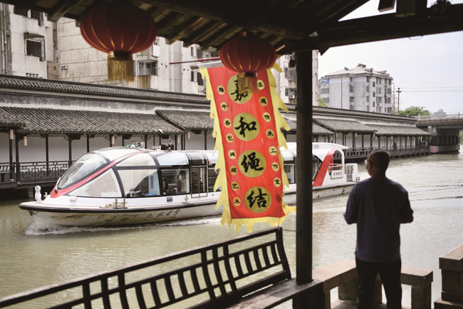 4月10日下午,嘉興市區環城河水面上,一艘水上巴士駛過。當天,嘉興市區公交、水上巴士等逐步恢復營運。(王振宇)