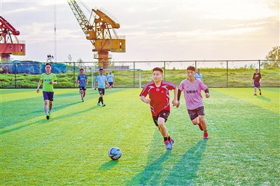 4月9日,在利用廢舊碼頭改造而成的安徽省銅陵市濱江生態體育公園,足球愛好者競逐綠茵,不遠處的碼頭吊臂高高矗立。近年來,各地注重盤活城市空閑土地,通過新建或改擴建體育公園、公共體育場館等,加大全民健身場地設施供給。