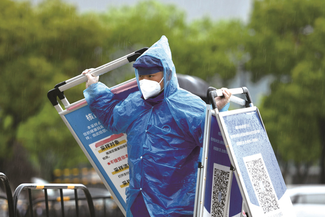 4月13日,在嘉興市區三元路上的新嘉街道核酸采樣點,來自嘉興藍天救援隊的志愿者們在大雨中堅守,協助完成核酸采樣。(王振宇)