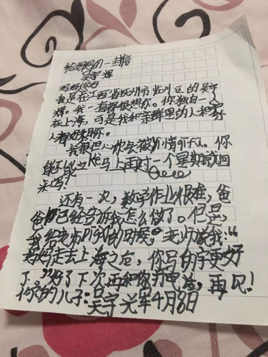 “收到回信后,孩子半天沒(méi)吱聲,看著看著眼眶就紅起來(lái)了。”吳宇輝的奶奶說(shuō),他媽媽不在家的這段時(shí)間,懂事了好多。