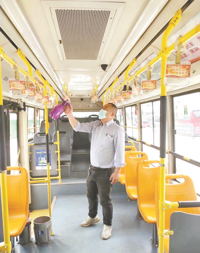 閑不住的柴曉軍總是自己動手,對人群接觸比較密集的扶手、座椅、投票箱、刷卡機(jī)等部位進(jìn)行重點(diǎn)消毒,提前開窗通風(fēng),確保給乘客提供干凈、安全的乘車環(huán)境。作為一名共產(chǎn)黨員,他始終發(fā)揮先鋒模范帶頭作用,積極向乘客普及防疫知識,同時提供線路咨詢、熱心幫扶等服務(wù),盡最大努力按照規(guī)范謹(jǐn)慎操作,讓乘客放心。
