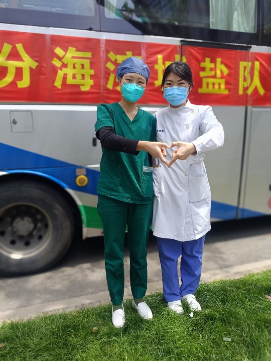 梁慧和姜蕾蕾一樣,在江蘇省鹽城市濱海縣第一人民醫院腦外科任職護士。作為一名擁有8年黨齡的老黨員,在得知上海需要支援時,她毫不猶豫地在單位報名加入了江蘇省援滬醫療隊鹽城濱海分隊。“我知道表妹已在一線日夜奮戰了一個多月了,這一次,我們姐妹倆也算是一起并肩作戰了”,梁慧笑著說道。