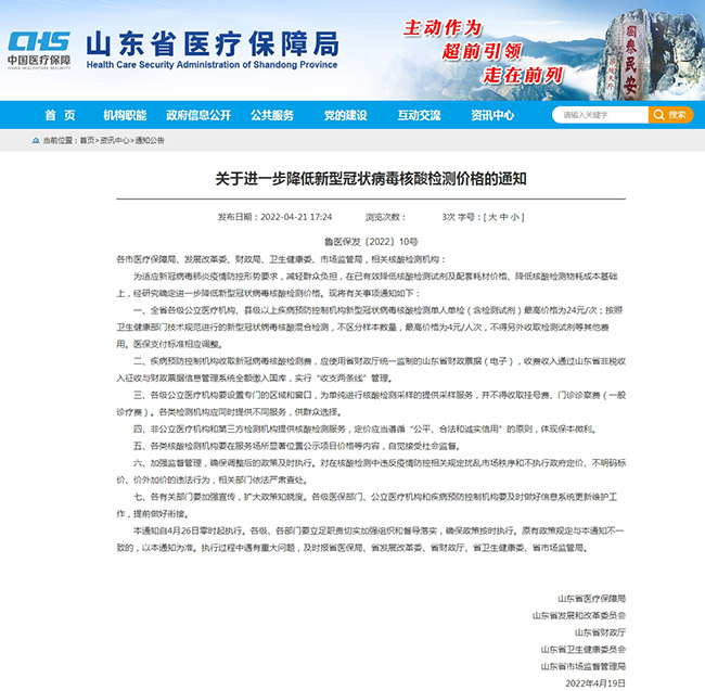 人民網濟南4月22日電(聶俊穹)21日,山東省醫保局、省發改委、省財政廳、省衛生健康委、省市場監管局等五部門聯合印發文件,自2022年4月26日零時起,進一步降低新型冠狀病毒核酸檢測價格。