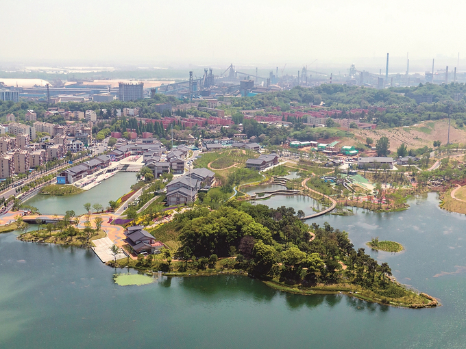 自二〇二一年起,南京啟動幸福河湖建設行動,截至目前,十七條幸福河湖已經建成。圖為昨日航拍的南京桃湖公園。 本報記者 陳儼 攝