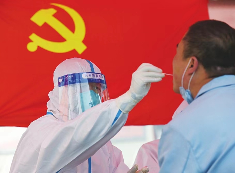 把黨旗插在第一線,以實際行動筑牢疫情防控“紅色防線”。4月26日,太原市迎澤區開展第三輪全員核酸檢測,在各個檢測點,最忙碌的還是身著防護服的“大白”,他們耐心又細致地為居民做著核酸檢測。武六紅 攝