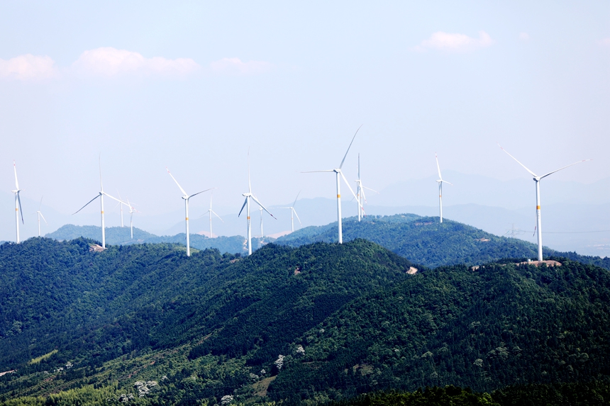 人民網南昌5月6日電 2022年5月5日,在江西省吉安市峽江縣羅田鎮玉峽風力發電場,一臺臺風力發電機矗立在群山之巔。據悉,該風力發電廠共有36臺風力發電機組成,裝機容量達82兆瓦,年發電量1.559億度。