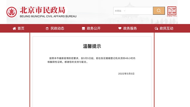 人民網北京5月7日電 據北京市民政局官網消息,按照北京市最新疫情防控要求,自5月5日起,前往各區婚姻登記機關須持48小時內核酸陰性證明。