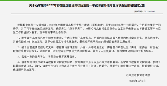 關于石家莊市2022年參加全國普通高校招生統一考試滯留外地考生盡快返回報名地的公告